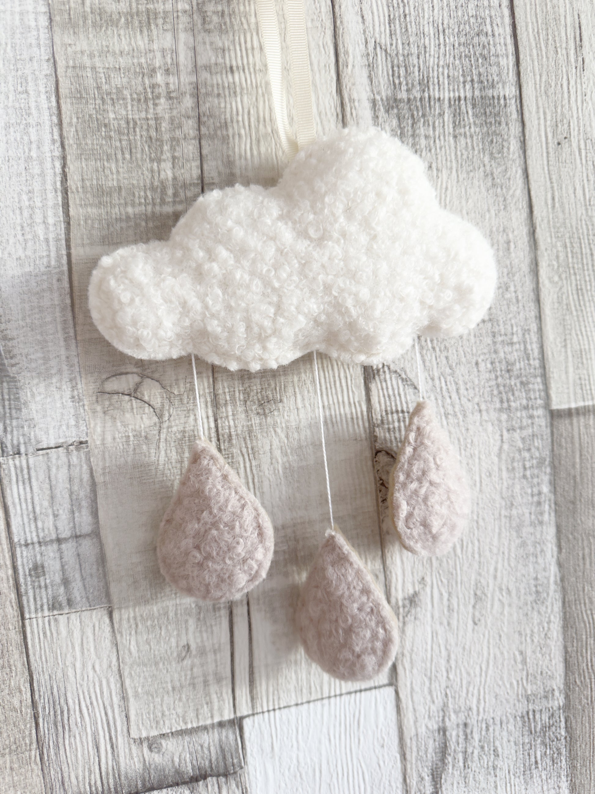 The cloud is made in Ivory bouclé and the raindrops are in Stone bouclé - a perfect neutral combination! The items are filled with toy stuffing for a lovely plump effect.