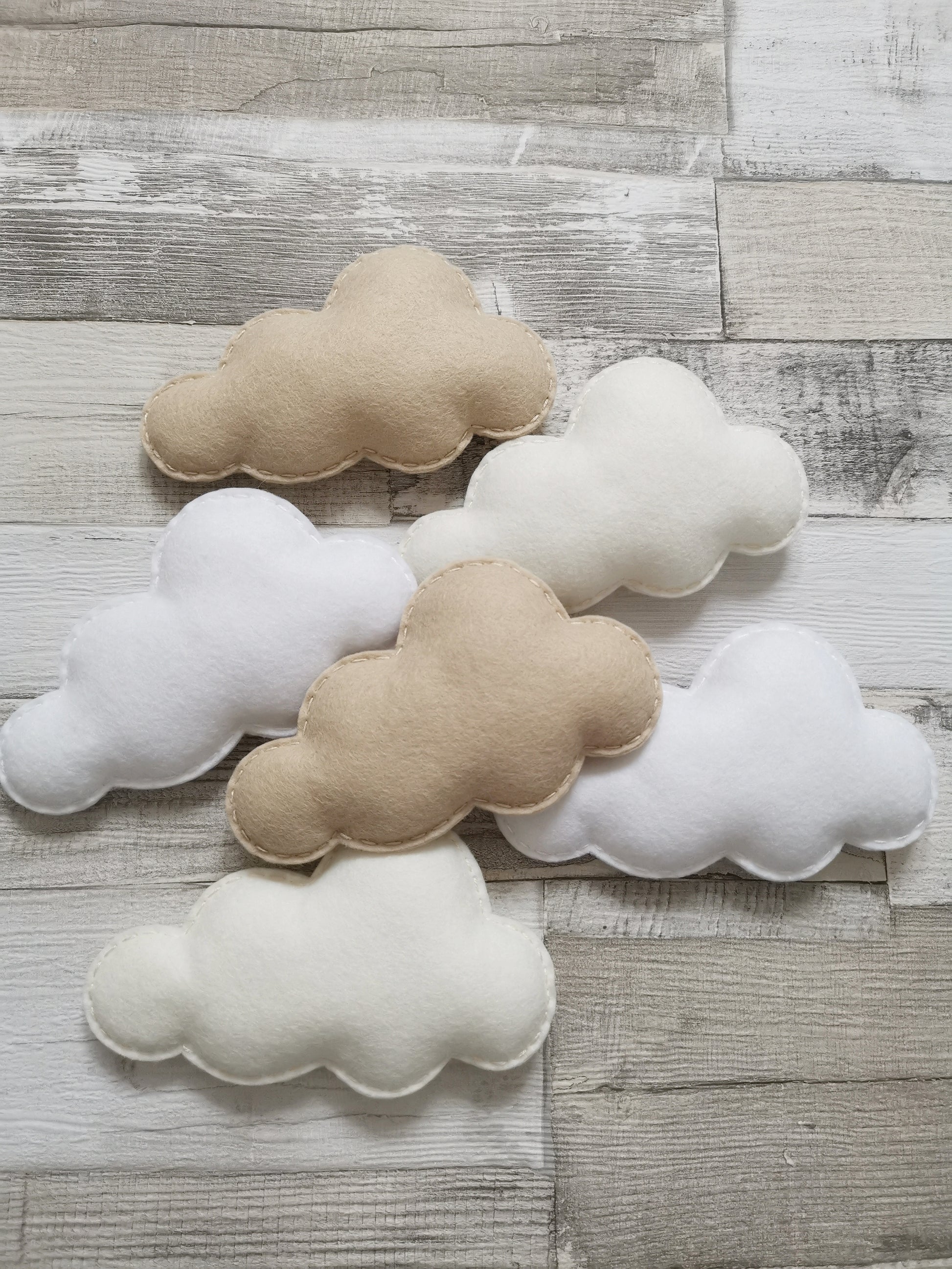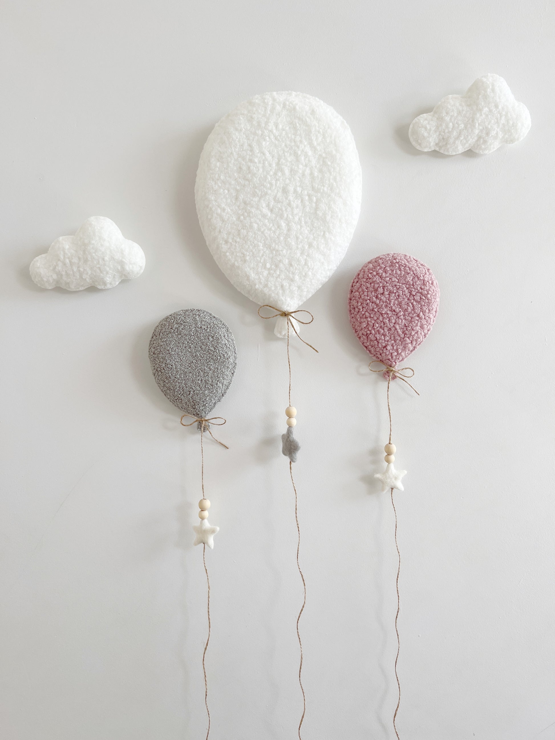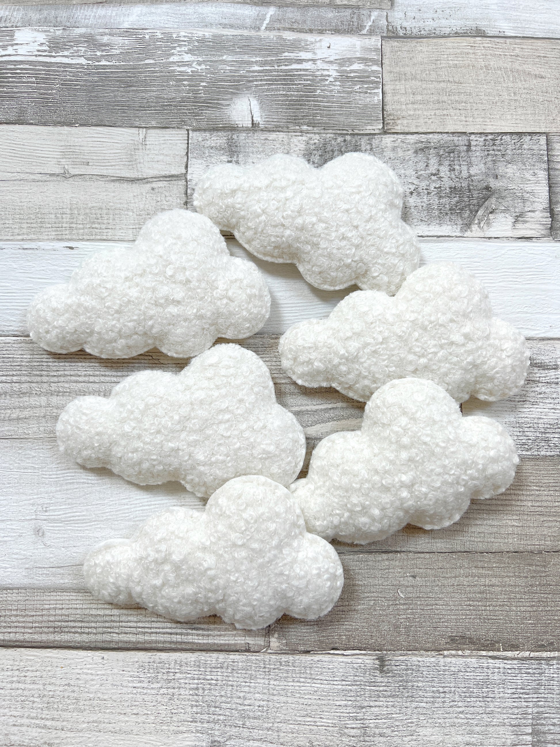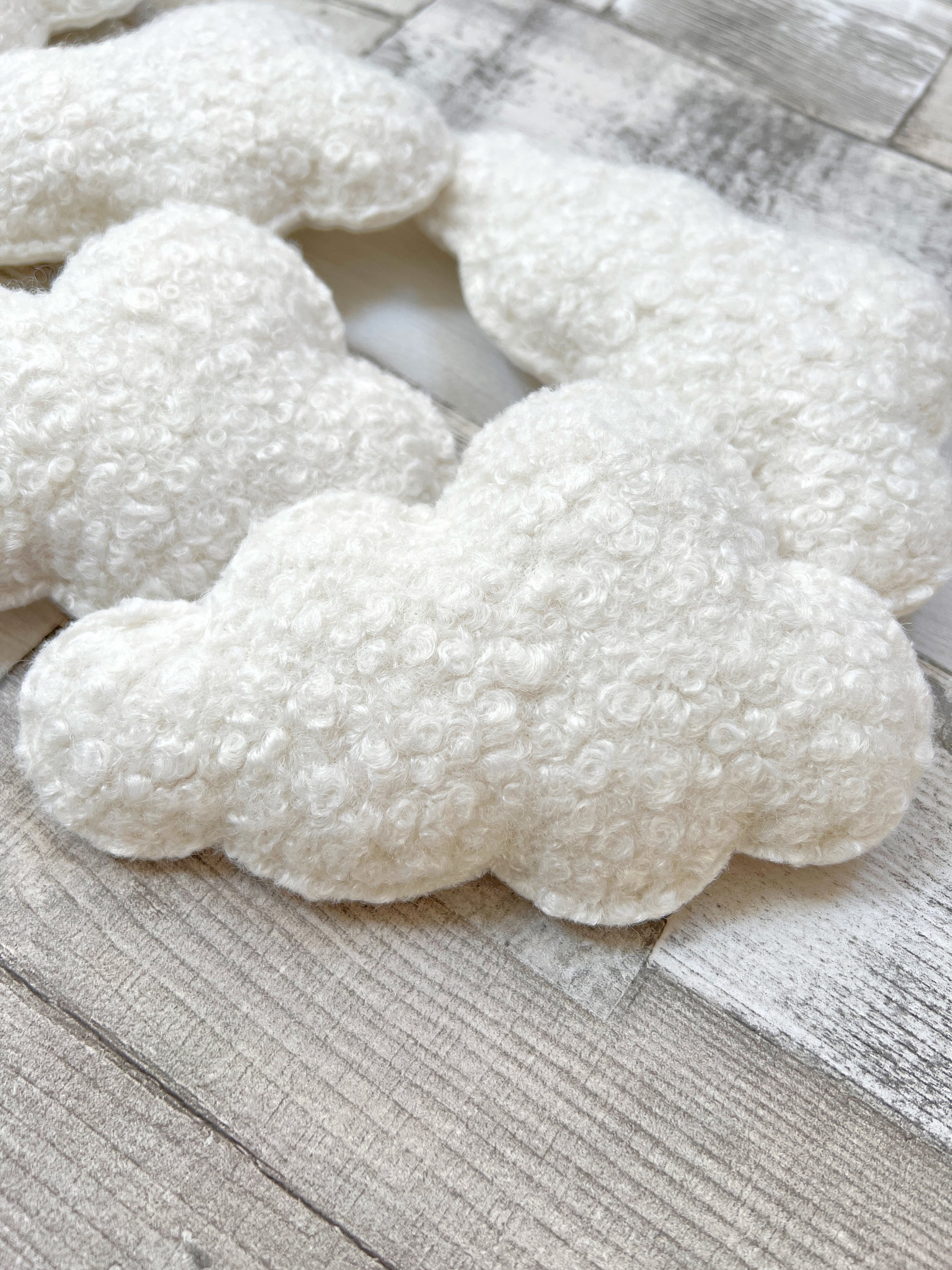 The clouds are made in a beautiful quality bouclé fabric and are sewn by hand and filled with toy stuffing for a lovely plump cloud.